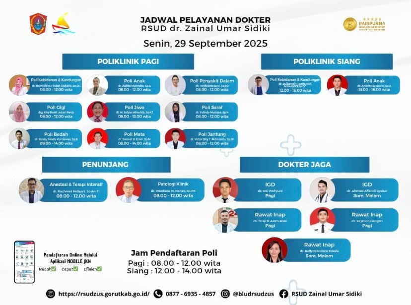 INFOPERAWAT.COM – Rumah Sakit Umum Daerah (RSUD) dr. Zainal Umar Sidiki resmi merilis jadwal pelayanan dokter untuk hari Senin, 29 September 2025. Pengumuman ini disampaikan guna memberikan kemudahan informasi kepada masyarakat yang membutuhkan layanan kesehatan di berbagai poliklinik.