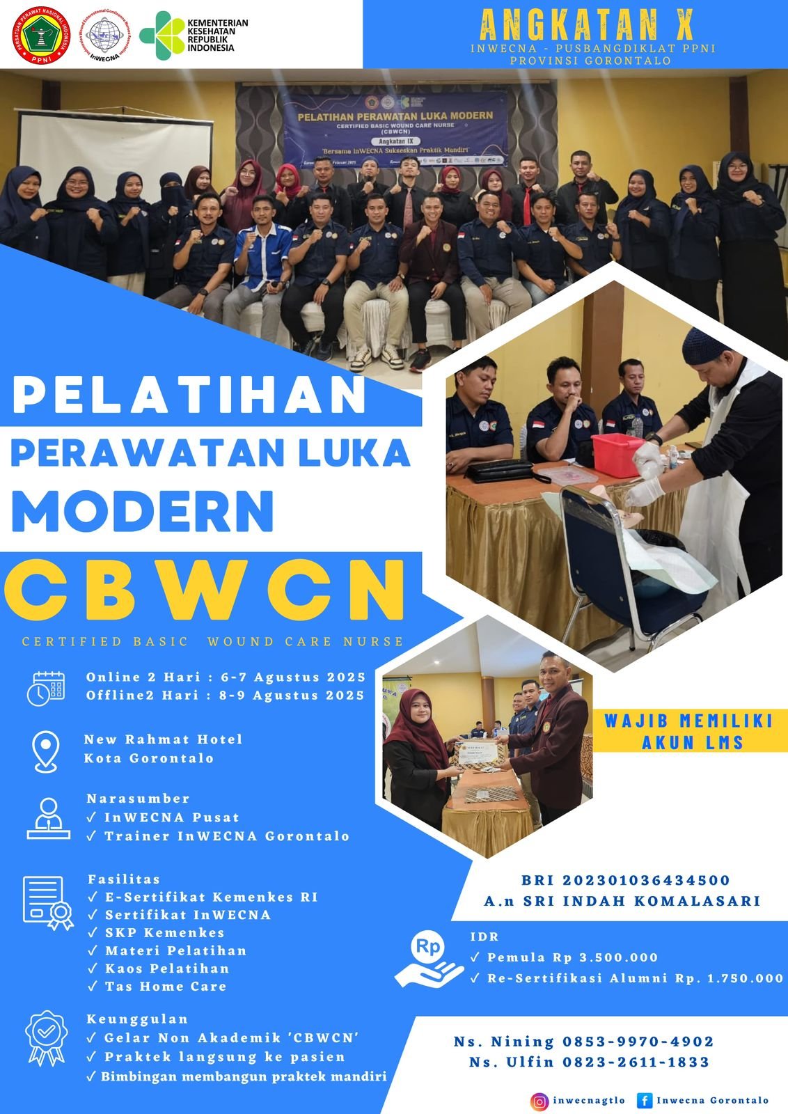 INFOPERAWAT.COM – Dalam upaya meningkatkan kualitas pelayanan keperawatan, Indonesia Wound Education Center & Nursing Academy (InWECNA) bekerja sama dengan Pusbangdiklat PPNI Provinsi Gorontalo kembali menggelar Pelatihan Perawatan Luka Modern CBWCN (Certified Basic Wound Care Nurse) Angkatan X.