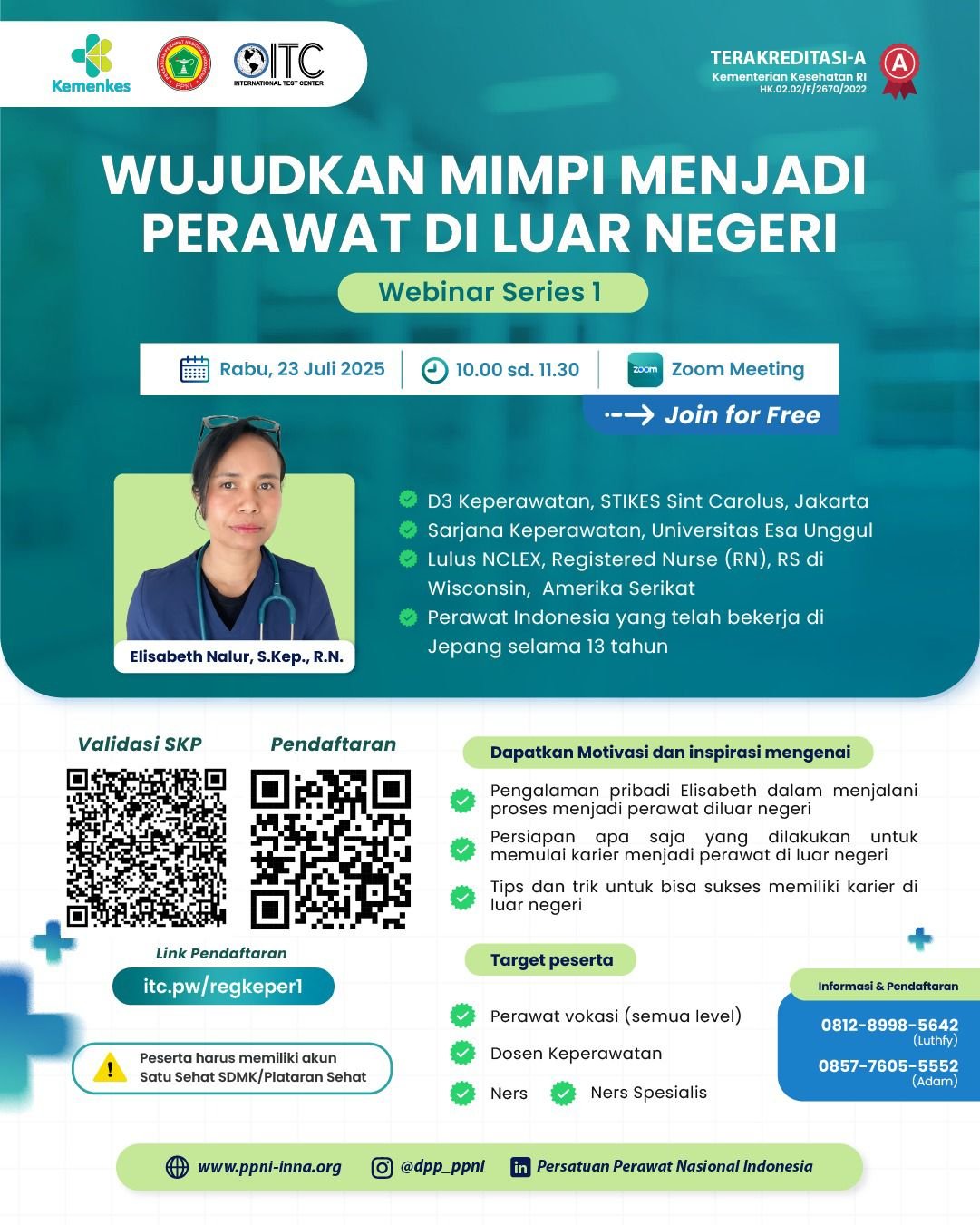 INFOPERAWAT.COM – Dalam upaya mendorong para tenaga keperawatan Indonesia untuk melebarkan sayap karier di kancah internasional, Persatuan Perawat Nasional Indonesia (PPNI) bekerja sama dengan International Test Center (ITC) dan Kementerian Kesehatan RI akan menggelar Webinar Series 1 bertajuk “Wujudkan Mimpi Menjadi Perawat di Luar Negeri” pada Rabu, 23 Juli 2025, pukul 10.00–11.30 WIB secara daring melalui Zoom.